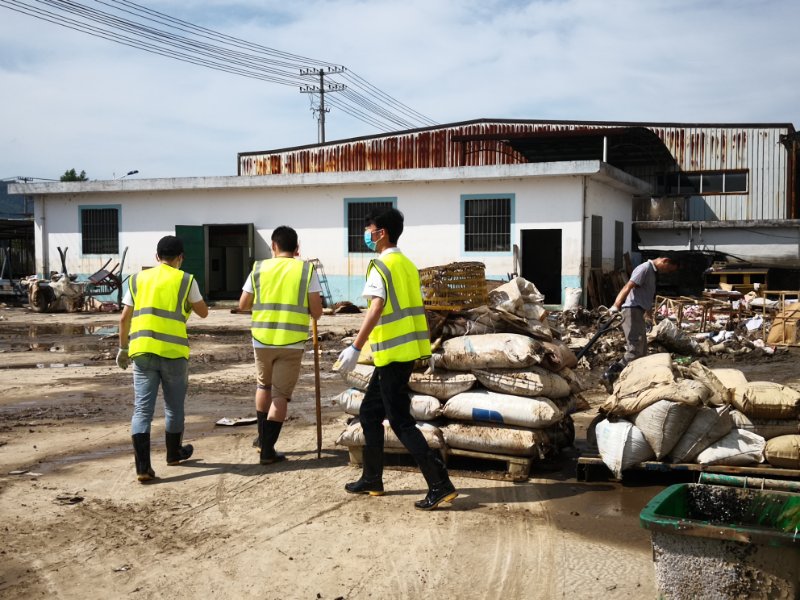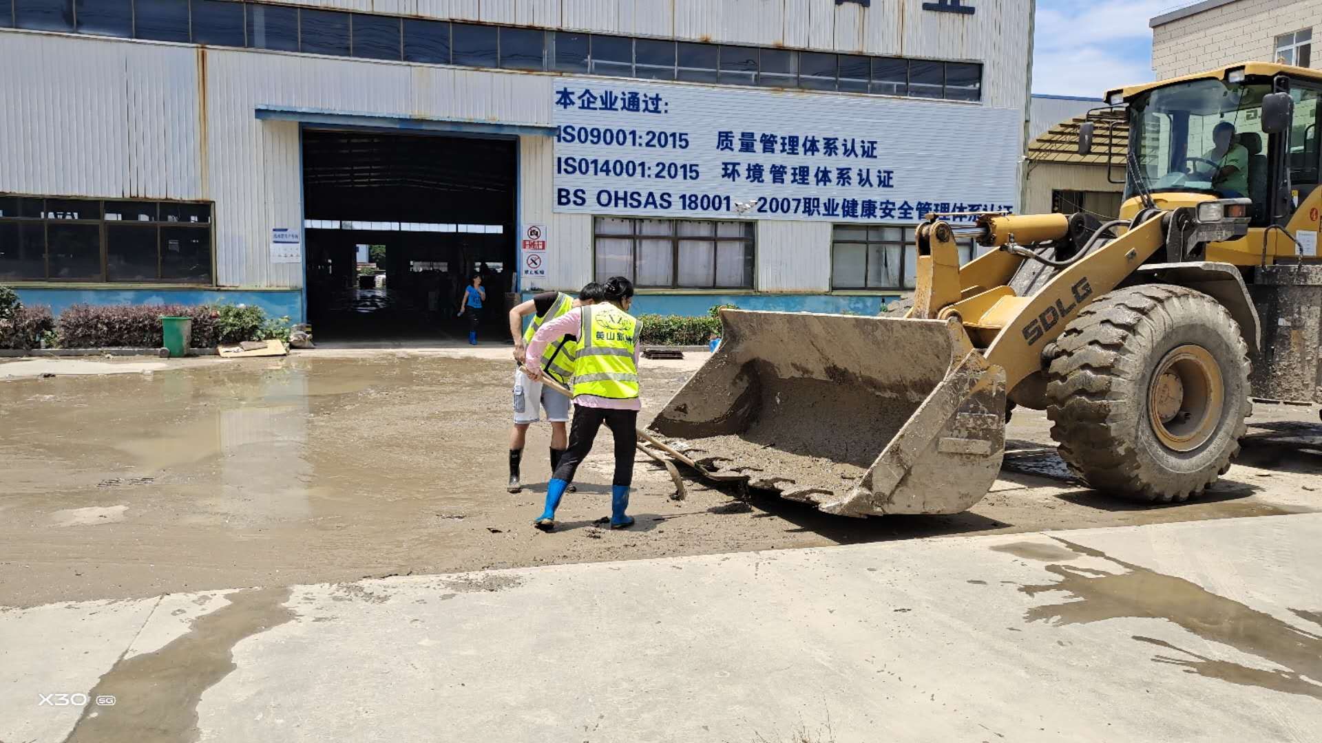 上午8時(shí)許,黃山新洲公司黨員、入黨積極分子、抗洪搶險(xiǎn)志愿者開(kāi)著鏟車(chē)、灑水車(chē)從屯溪區(qū)出發(fā)到達(dá)歙縣經(jīng)開(kāi)區(qū)受澇嚴(yán)重的黃山順濤管業(yè)有限公司進(jìn)行衛(wèi)生清掃,先清理垃圾及淤泥,再進(jìn)行集中消毒消殺。烈日炎炎,新洲支部的黨員志愿者們個(gè)個(gè)不怕臟,不怕累,頂著烈日,揮汗如雨。通過(guò)一個(gè)上午的勞動(dòng),在人機(jī)配合下,掃除了垃圾,清除了表面泥土,受災(zāi)企業(yè)的工作環(huán)境煥然一新。