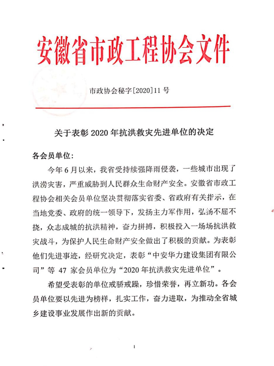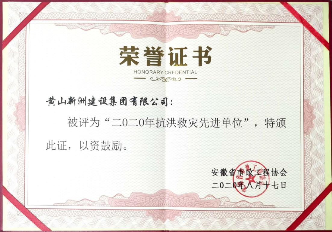 2020年8月17日,黃山新洲建設(shè)集團(tuán)有限公司榮獲“2020年抗洪救災(zāi)先進(jìn)單位”稱(chēng)號(hào)。