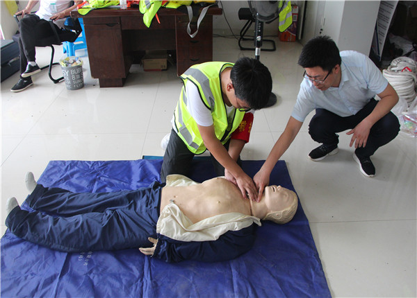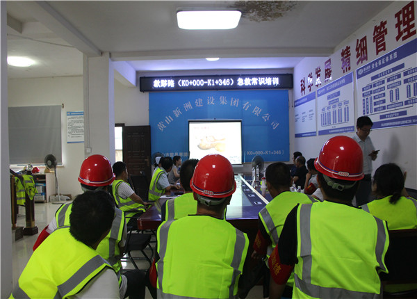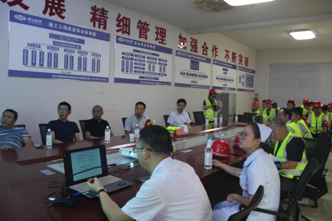 為確保演練順利進(jìn)行,項(xiàng)目經(jīng)理巴亮(現(xiàn)場指揮)組織多次預(yù)演,并邀請歙縣人民醫(yī)院專家于歙黟路項(xiàng)目部會(huì)議室進(jìn)行現(xiàn)場急救常識(shí)培訓(xùn)(止血方法、包扎、固定、搬運(yùn)等創(chuàng)傷技術(shù)、心肺復(fù)蘇急救方法等)。