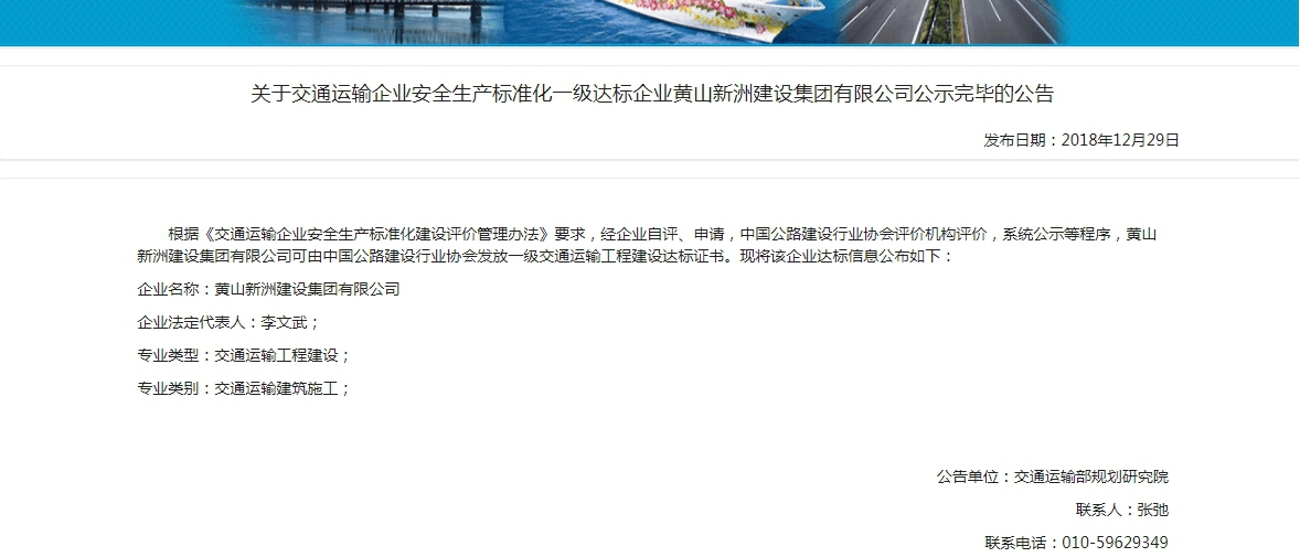 近日從交通運(yùn)輸企業(yè)安全生產(chǎn)標(biāo)準(zhǔn)化管理系統(tǒng)獲悉,黃山新洲建設(shè)集團(tuán)有限公司交通運(yùn)輸部安全生產(chǎn)標(biāo)準(zhǔn)化一級達(dá)標(biāo)已公告,標(biāo)志著我集團(tuán)公司的交通建設(shè)工程安全生產(chǎn)標(biāo)準(zhǔn)化工作上升了一個(gè)新的臺階。自2018年1月份開始至今安全生產(chǎn)標(biāo)準(zhǔn)化創(chuàng)標(biāo)工作經(jīng)過一年多的申報(bào)、現(xiàn)場考核、考評工作圓滿結(jié)束。